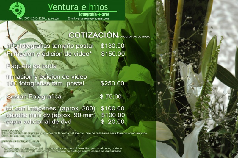 Nos especializamos en tomas de foto y vídeo para diferentes eventos sociales y culturales y también nos ponemos a sus ordenes en lo que son las tomas de fotos de matrícula en papel granulado blanco y negro a diferentes puntos del país atendiendo instituciones estudiantiles como colegios escuelas e institutos nacionales y técnicos. Con más de 40 años de experiencia en el área de la fotografía, que lleva realizando todo tipo de trabajos con profesionalismo y calidad.